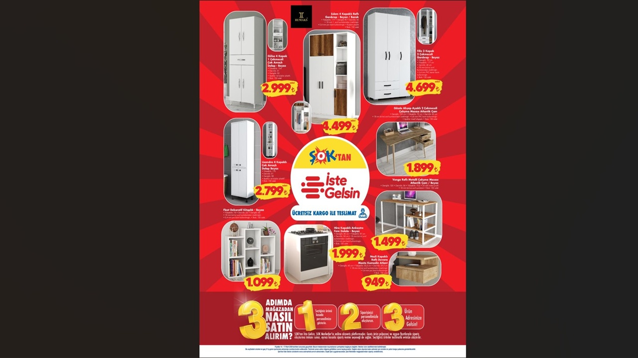 Sadece teknoloji değil, evini yenilemek isteyenler için de ŞOK’ta büyük fırsatlar var. Gardıroplardan çok amaçlı dolaplara kadar birçok mobilya ürünü, piyasa şartlarına göre oldukça uygun etiketlerle satışa sunuluyor: